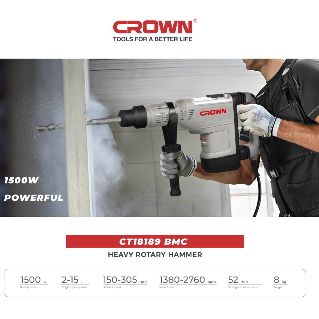 Crown 1500W Demolition Hammer | CT18189 VendorCrown Share WhatsApp Deel X Pin it Messenger Email Crown 1500W Demolition Hammer | CT18189 VendorCrown Share WhatsApp Deel X Pin it Messenger Email Product form SKU: CT18189 Description: The Crown CT18189 Breaker Hammer is a high-performance tool designed for heavy-duty drilling and breaking tasks in concrete and... Read more 360.000 JD Excl. VAT Quantity Add to cart This item is a recurring or deferred purchase. By continuing, I agree to the cancellation policy and authorize you to charge my payment method at the prices, frequency and dates listed on this page until my order is fulfilled or I cancel, if permitted.