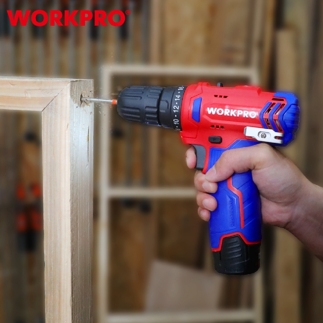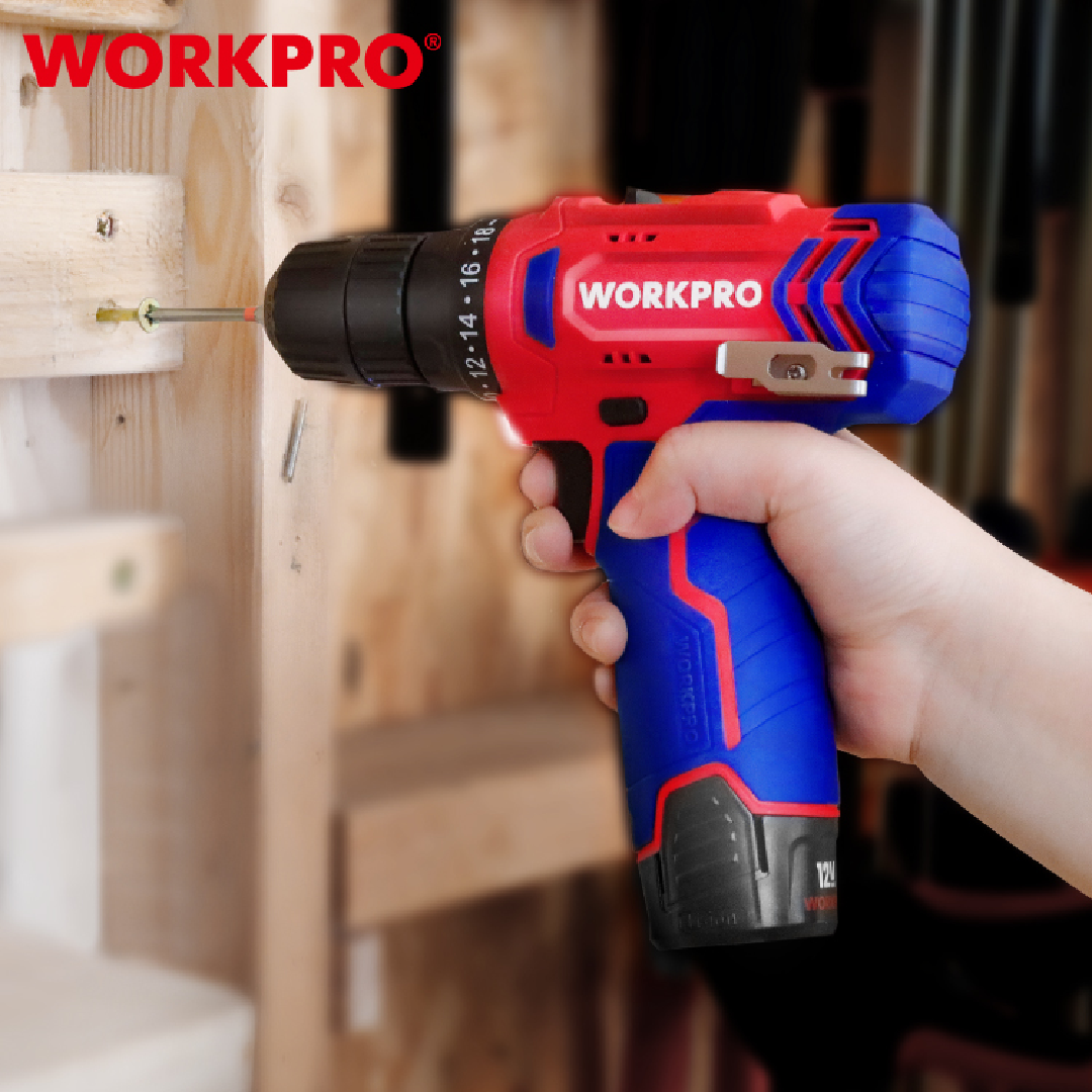 دريل لاسلكي احترافي من WORKPRO — موديل WP460203 يعمل ببطارية 12V ومزوّد بسرعة متغيرة ومفتاح شدّ 10 مم، مما يجعله مثالياً لأعمال التركيب المنزلية والمهنية الخفيفة. يوفر قوة مناسبة للحفر في الخشب والبلاستيك والمعادن الخفيفة، مع تصميم مدمج وسهل الحمل.