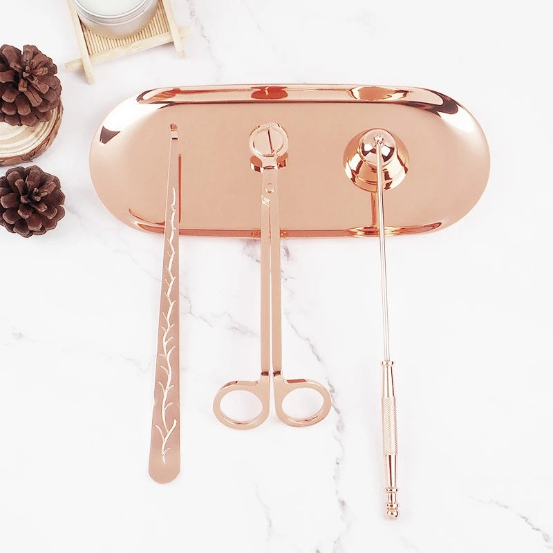 • الطقم مكون من: مقص فتيلة الشمعة، طفاية شموع، أداة تعديل فتيلة الشمعة، صينية