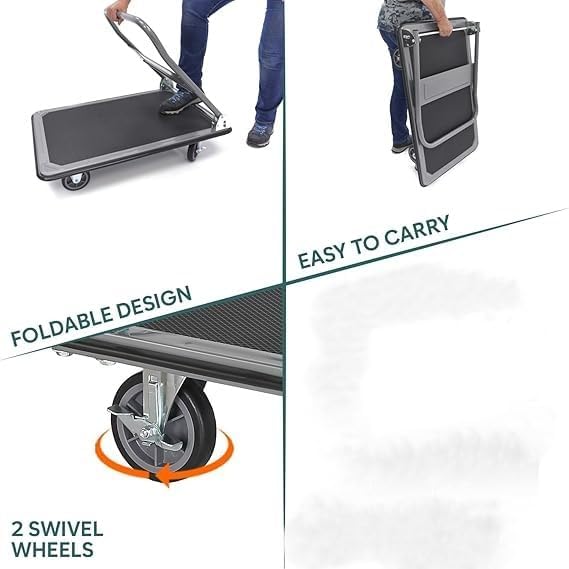 عرباية نقل مسطّحة قوية ومصمّمة خصيصًا لأعمال الورش والمستودعات والمحلات. تتحمّل وزن يصل إلى 130 كيلوغرام مع سطح تحميل معدني متين وحجم عملي يساعدك في نقل البضائع بسهولة وسرعة.