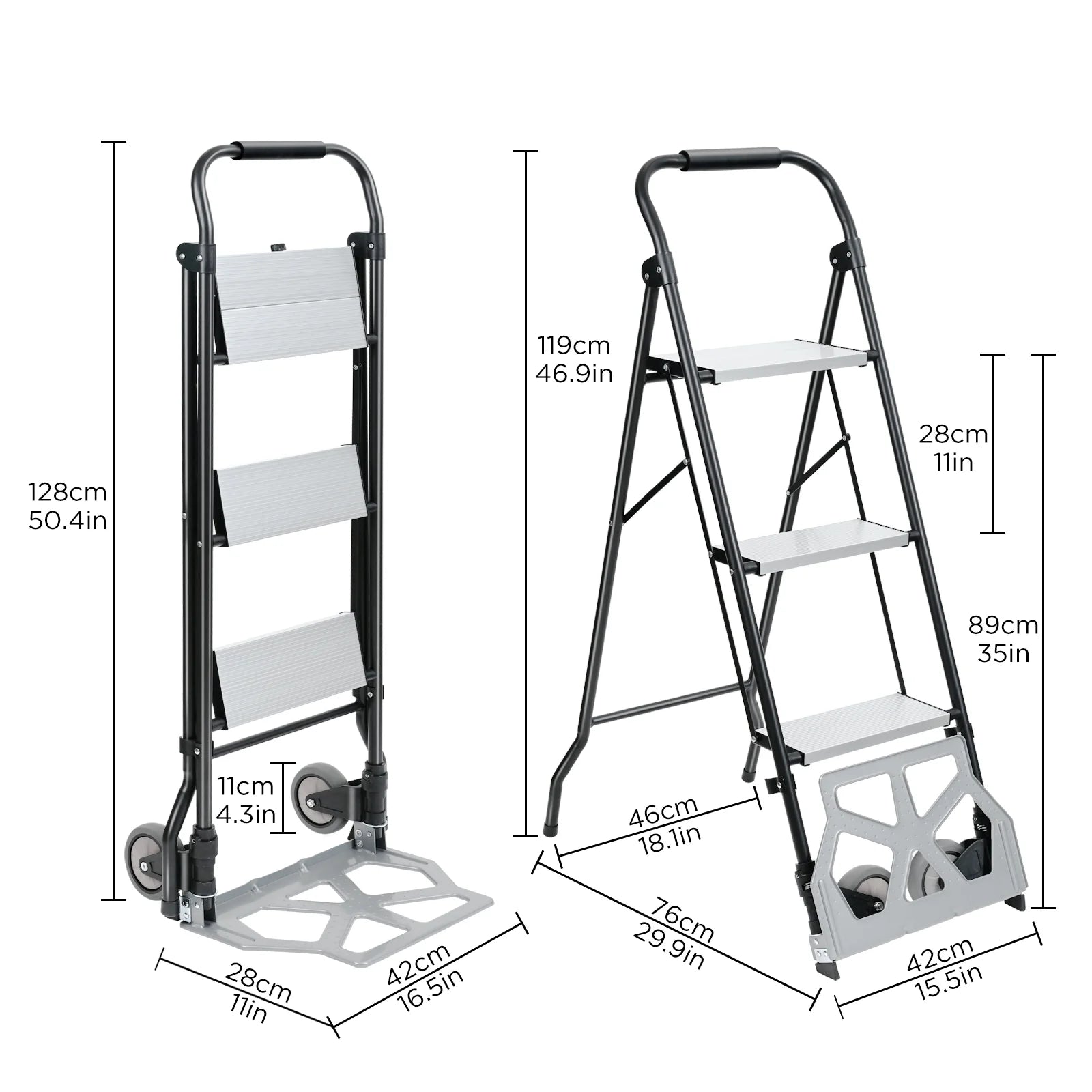 مصنوع من إطار ألمنيوم قوي مع طبقة طلاء مقاومة للصدأ، مما يوفر متانة عالية في وضعية السلّم أو وضعية عربة النقل.