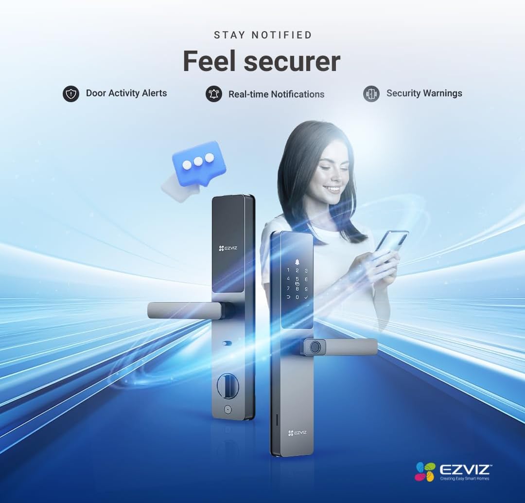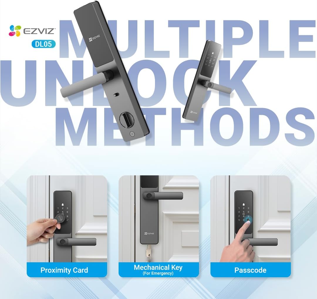- طرق فتح متعددة: استمتع براحة الدخول بدون مفتاح مع خيارات تشمل التعرف على بصمات الأصابع، ورمز المرور، وبطاقة القرب، والهاتف الذكي عبر تطبيق EZVIZ. مثالي للحياة العصرية الآمنة.