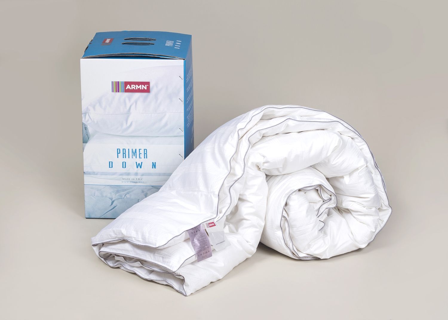 لحاف متوسط الحجم من ARMN Primer Down مصنوع من غطاء من القطن الساتان ومعبأ بزغب وريش البط، يوفر راحة على مدار السنة.