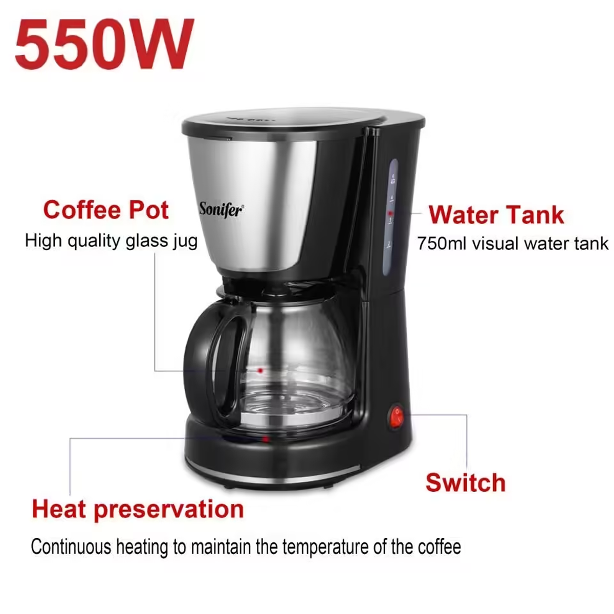 ماكينة القهوة بالتنقيط من Sonifer مصممة خصيصًا لتناسب المنازل الصغيرة أو الاستخدام الشخصي، بفضل حجمها العملي وسهولة استخدامها. بقدرة 550 واط وسعة 0.75 لتر، تُمكنك من تحضير ما يصل إلى 6 أكواب من القهوة الغنية خلال دقائق. تتميز بخاصية منع التنقيط، فلتر دائم قابل للغسل، وصفيحة تسخين تحافظ على سخونة القهوة تلقائيًا. تصميم أنيق وعصري ينسجم مع أي مطبخ، مما يجعلها الرفيق المثالي لبداية يومك.