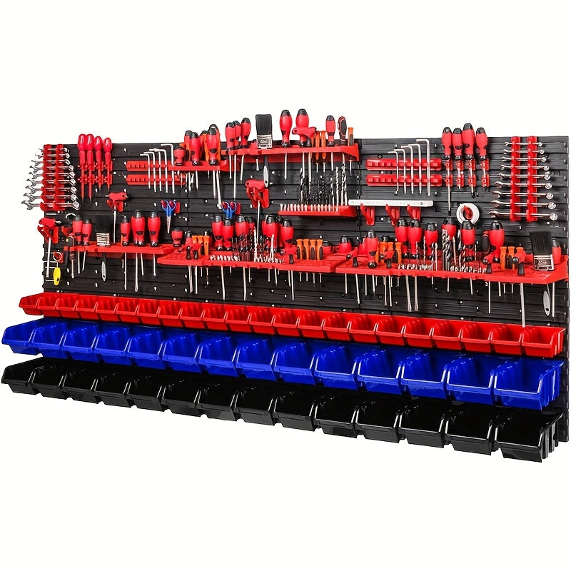 مجموعة منظم الأدوات شديدة التحمل المكونة من 94 قطعة هي حل عملي وفعّال لتنظيم الأدوات في ورش الغراج وأماكن العمل. تم تصميم الرف ليكون موفّرًا للمساحة مع نظام تعليق جداري يسهّل ترتيب الأدوات والوصول إليها بسرعة وكفاءة.