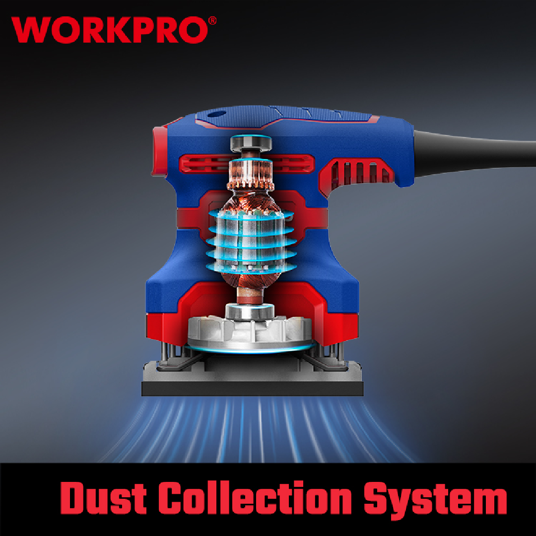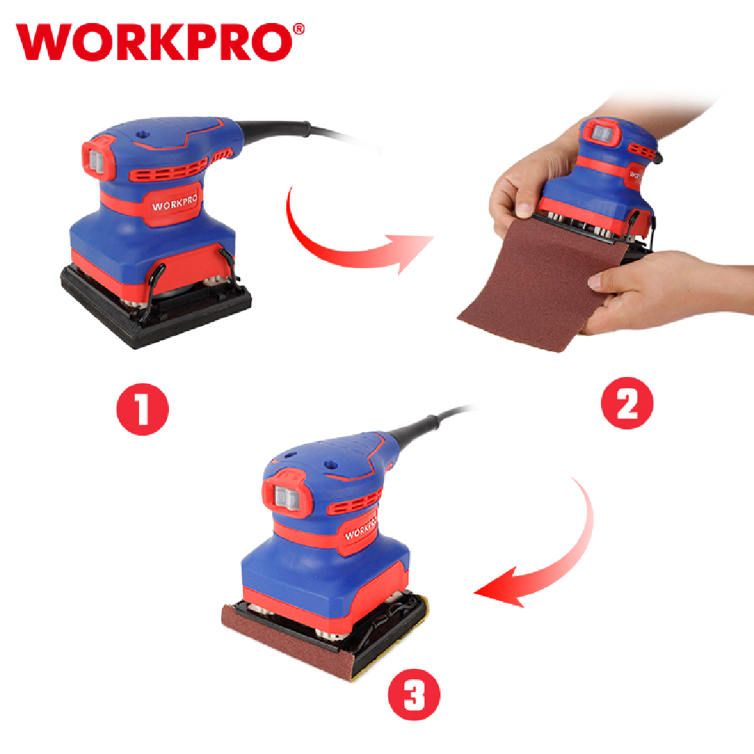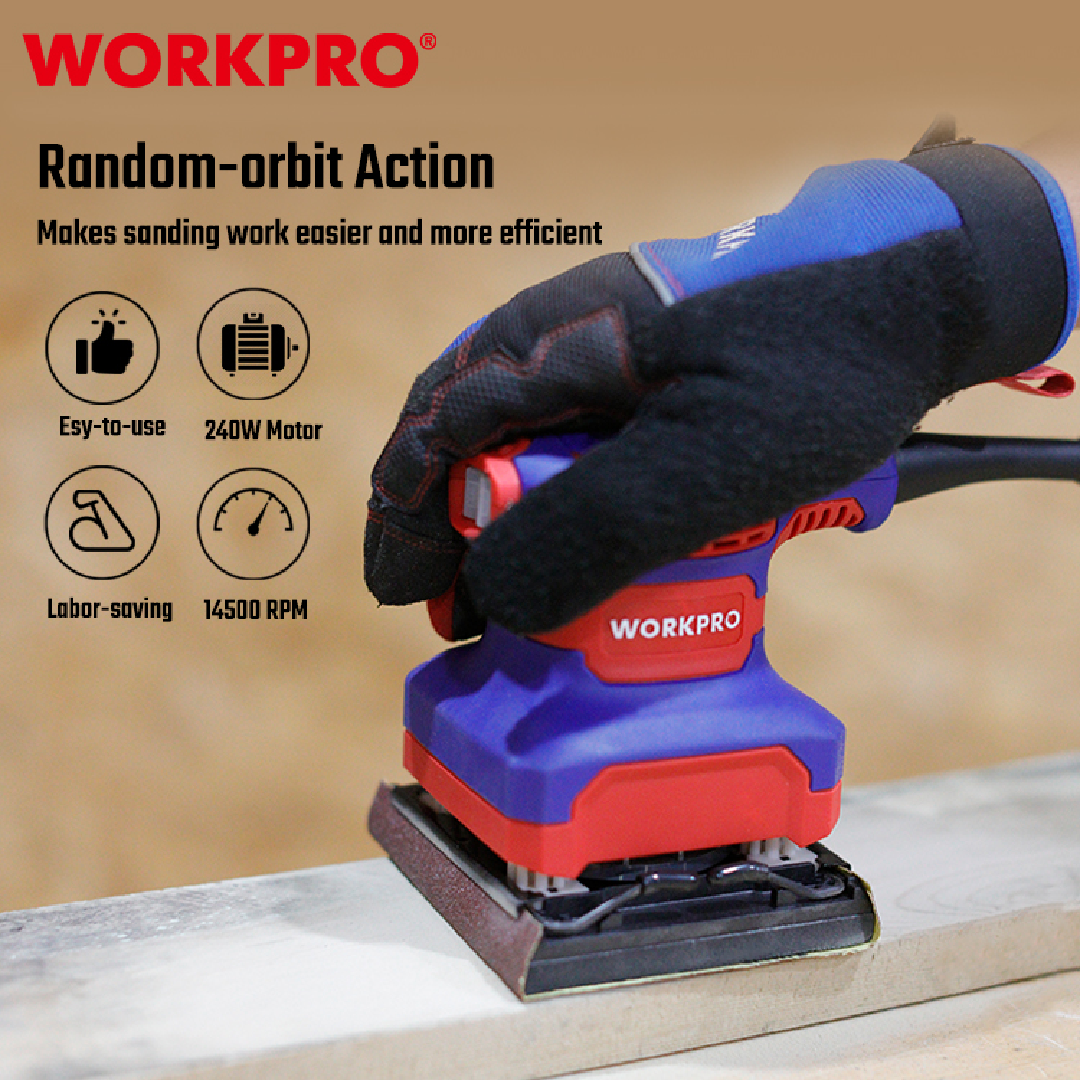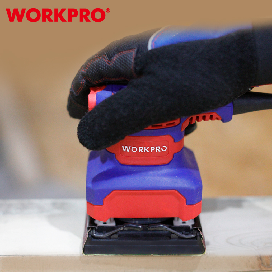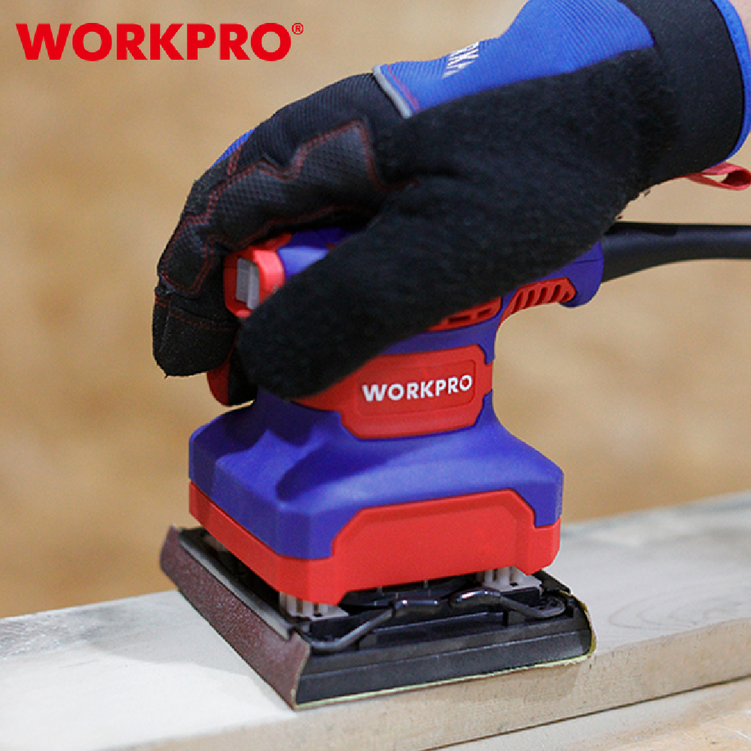 آلة صنفرة احترافية من WORKPRO — موديل WP472400 بمقاس 110×100 مم (1/4 ورقة)، مناسبة لأعمال الصنفرة الدقيقة وتشطيب الأسطح الصغيرة والمتوسطة. تعمل بمحرك قوي يوفر أداءً ثابتاً ونتائج ناعمة، مما يجعلها مثالية لورش النجارة، صيانة الأثاث، وأعمال الدهان.