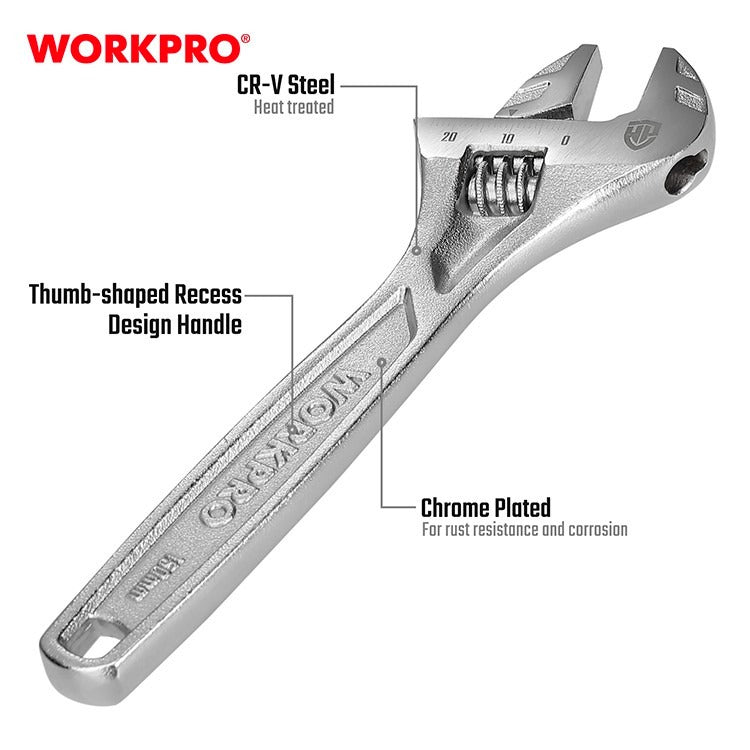 مفتاح WORKPRO WP272007 هو مفتاح قابل للتعديل بقطر 200 مم (8 بوصات) مصمم لمهام ميكانيكية متنوعة، بما في ذلك إصلاحات السيارات والسباكة والصيانة العامة. مصنوع من فولاذ الكروم الفاناديوم المعالج بالحرارة (CR-V) لتعزيز القوة والمتانة، ويتميز بطبقة نهائية مطلية بالكروم لمقاومة الصدأ والتآكل. يسمح النقش الكبير بإجراء تعديلات سهلة، مما يضمن قبضة آمنة على أدوات التثبيت، بينما يوفر المقبض المريح الراحة أثناء الاستخدام لفترات طويلة.