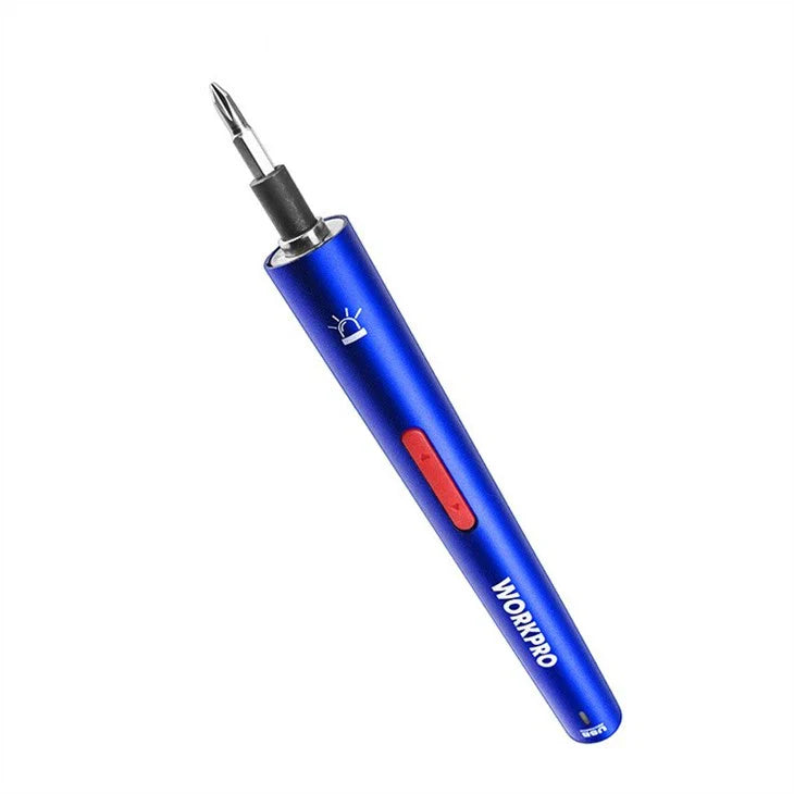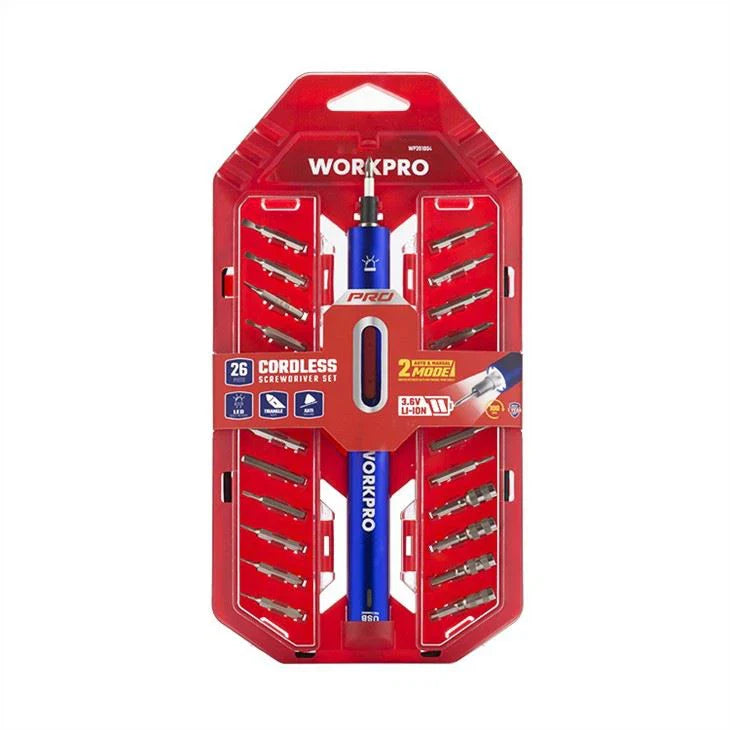 طقم مفكات البراغي الدقيقة WORKPRO، المكون من ٢٦ قطعة، بجهد ٣.٧ فولت، والقابل لإعادة الشحن عبر USB، هو أداة صغيرة الحجم ومتعددة الاستخدامات، مصممة للمهام الدقيقة مثل تجميع وتفكيك الأجهزة الإلكترونية. تصميمه المريح، إلى جانب مجموعة شاملة من رؤوس البراغي، يجعله مثاليًا للمحترفين وهواة الأعمال اليدوية.