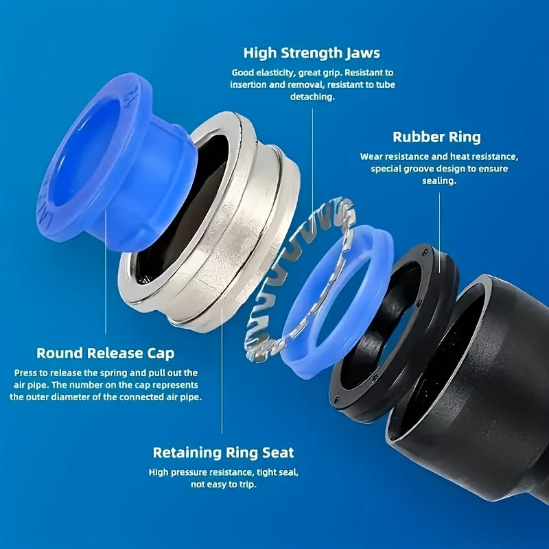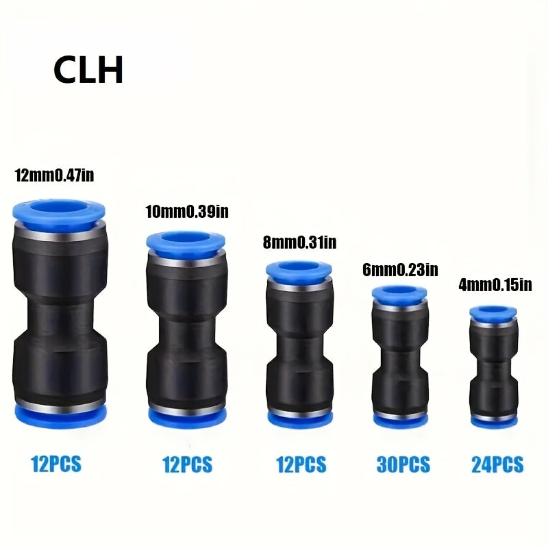 تتضمن المجموعة وصلات مستقيمة بلاستيكية مزودة بغطاء فصل سريع (Quick Release Cap)، تتيح توصيلًا محكمًا وتقليل تسرب الهواء مع سهولة التركيب والفك. تتميز الوصلات بمعيار خيط متوافق مع الأنظمة الأوروبية والأمريكية، مما يضمن مرونة عالية في الاستخدام مع مختلف معدات الهواء.