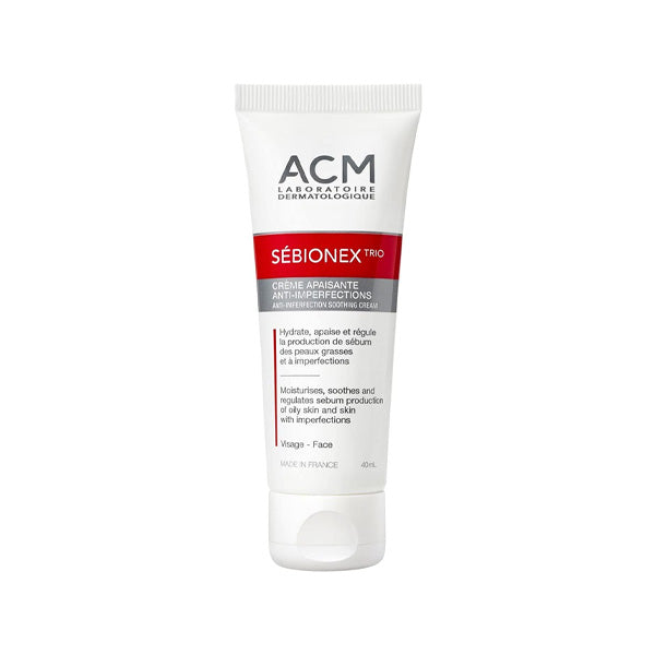 كريم ACM Sebionex Trio المهدئ المضاد للعيوب 40 مل هذا الكريم التصحيحي للبشرة الدهنية والمعرضة للشوائب، يستخدم على الوجه، إما بمفرده أو كمكمل لعلاجات مكافحة حب الشباب. يتمتع هذا الكريم بفعالية عالية ضد أشد عيوب البشرة الناجمة عن حب الشباب، فهو يجمع بين ثلاثة تأثيرات متكاملة: