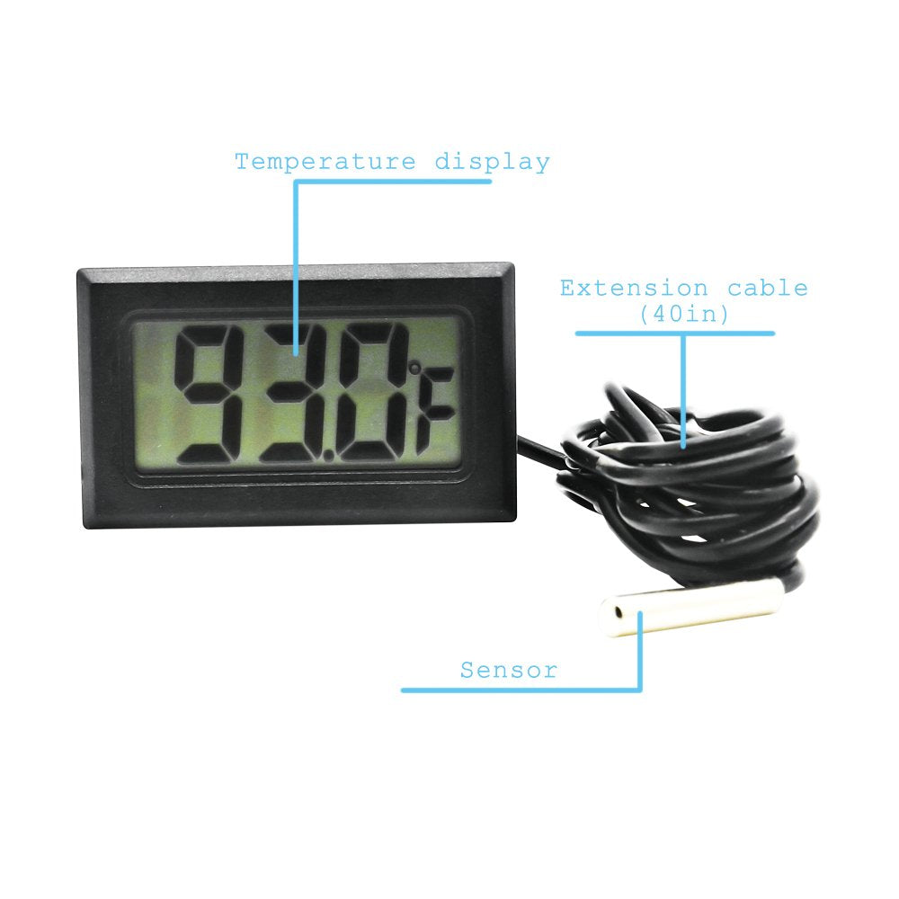 The thermometer comes with 1m cable metal sensor probe, perfect for use in refrigerator, aquarium tank, fish tank,pet cage, kitchens,3D printer, solar system, cellar,humidors, incubator or any other places that require monitoring of temperature.