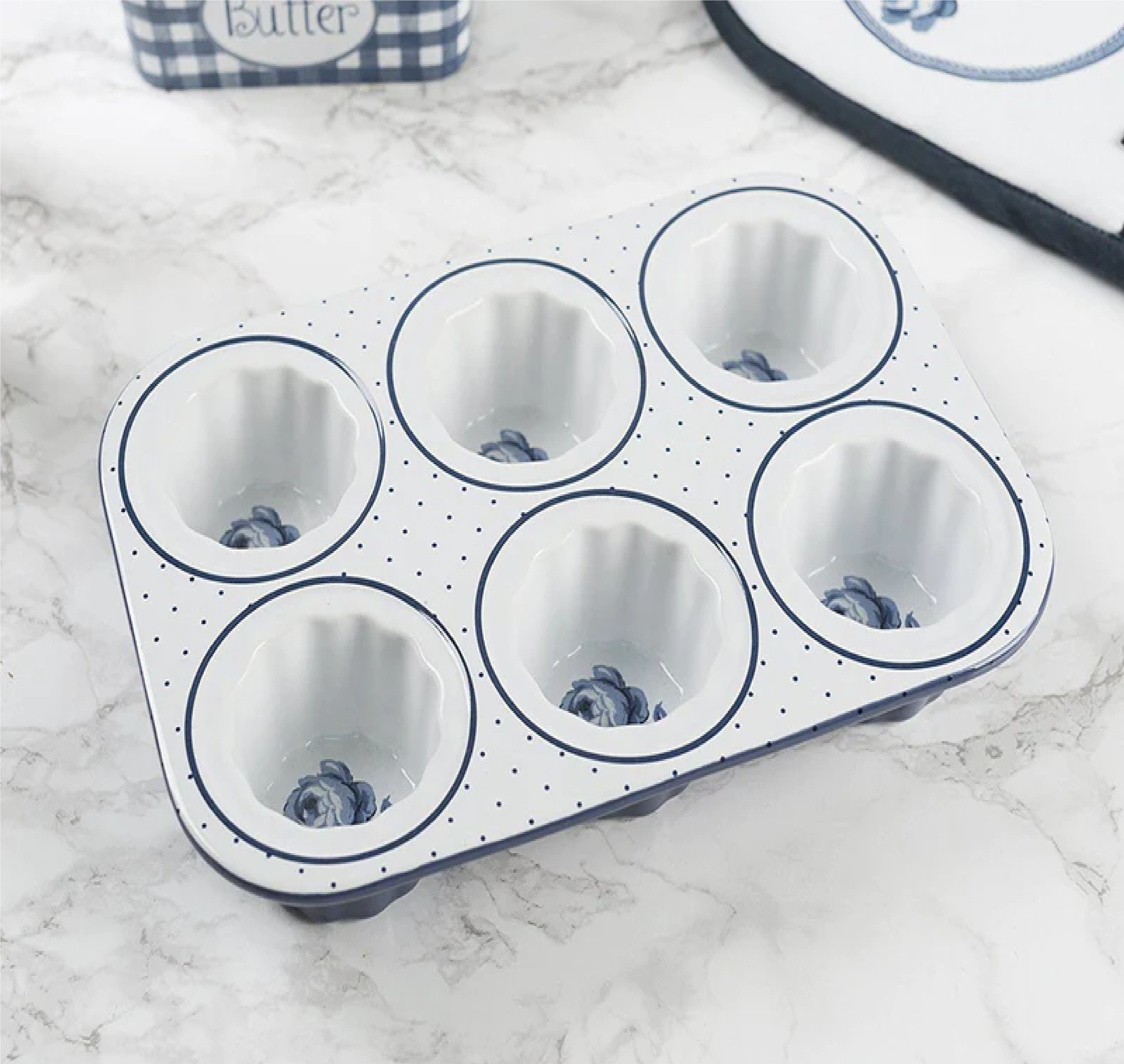 This ceramic muffin tray is a stunning piece for beautiful baking. The vintage Indigo design is one that bakers will love to use every time and with six large moulds it will produce a batch of generously-sized muffins. A vintage Blue and white look with a modern twist of stylish motifs, delicate Blue polka dots contrast against super white and a single dark Blue rose is scattered in each individual cake mould.