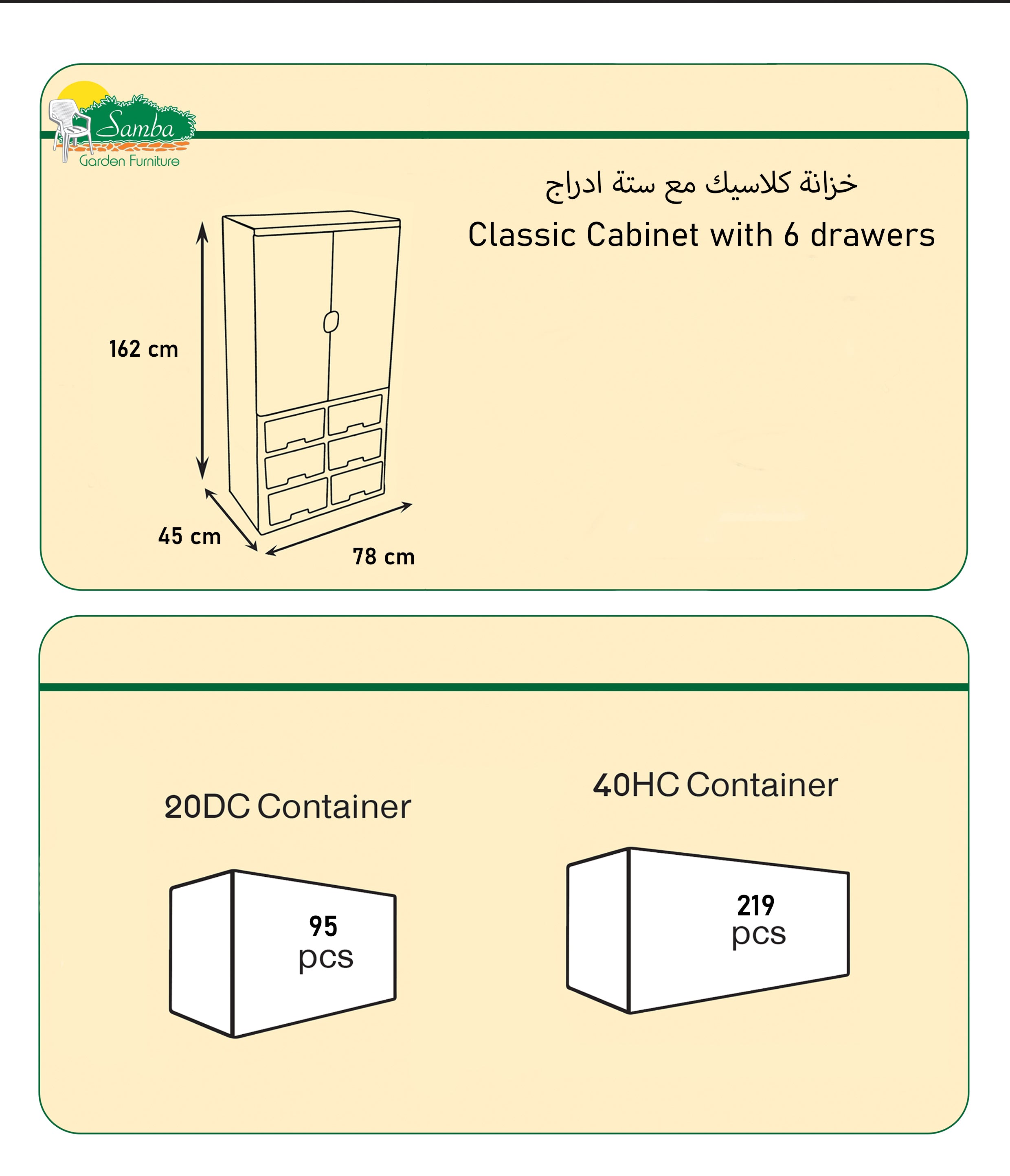 شرح موجز للخواص العامة: خزانة كلاسيك مع 6 ادرج هي الخيار المثالي لزيادة تنظيم المساحات الداخلية. تتميز بتصميمها الأنيق ومرونتها في الاستخدام، مما يجعلها مناسبة لكل من المنازل والمدارس. اختر من بين مجموعة ألوان جذابة تناسب ذوقك.