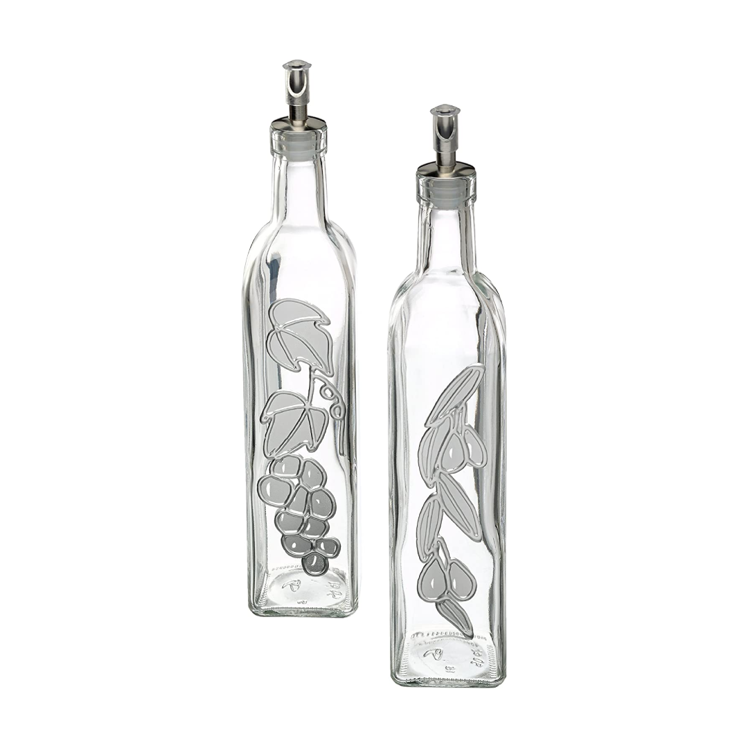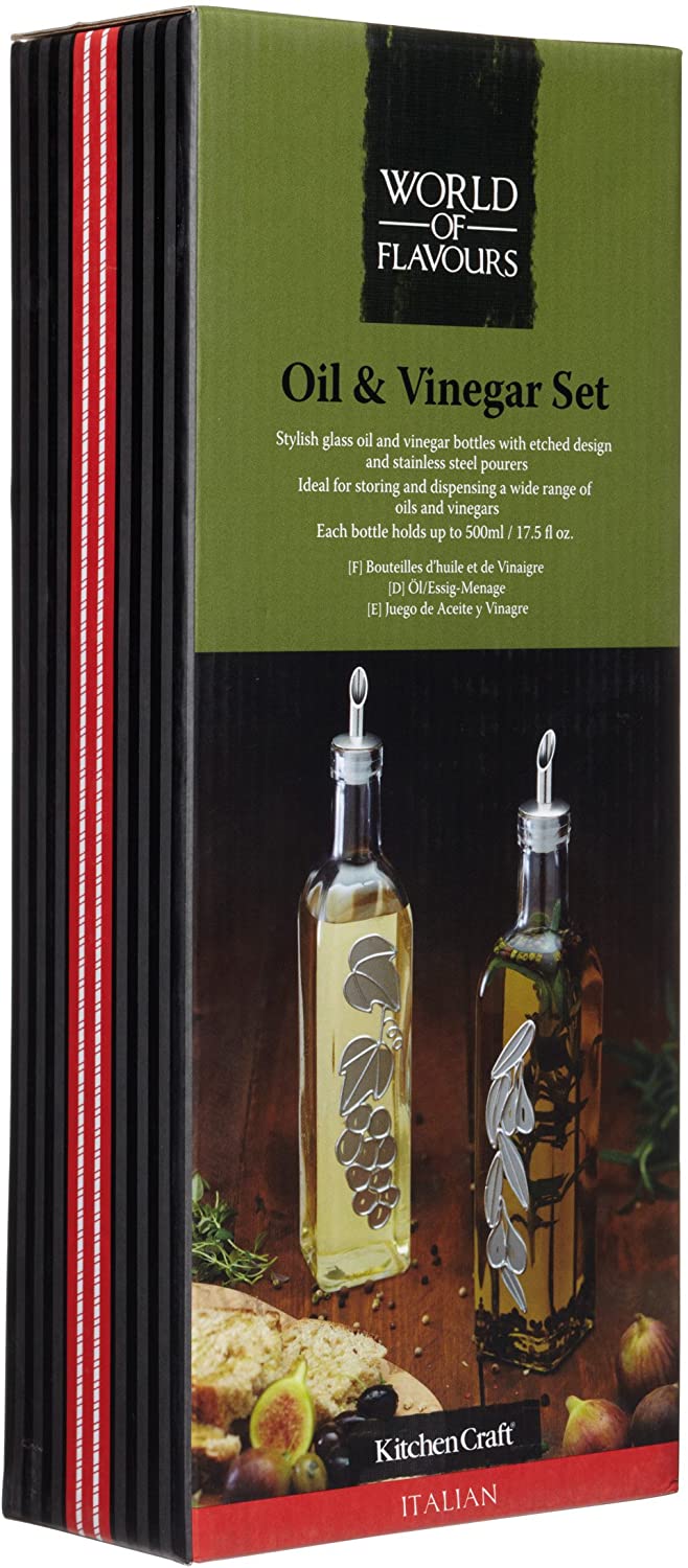 KitchenCraft World of Flavours Decorated Glass Oil and Vinegar Bottles, 500 ml & Stainless Steel Mini Kitchen/Hip Flask Funnel, 5.5 cm (2")
