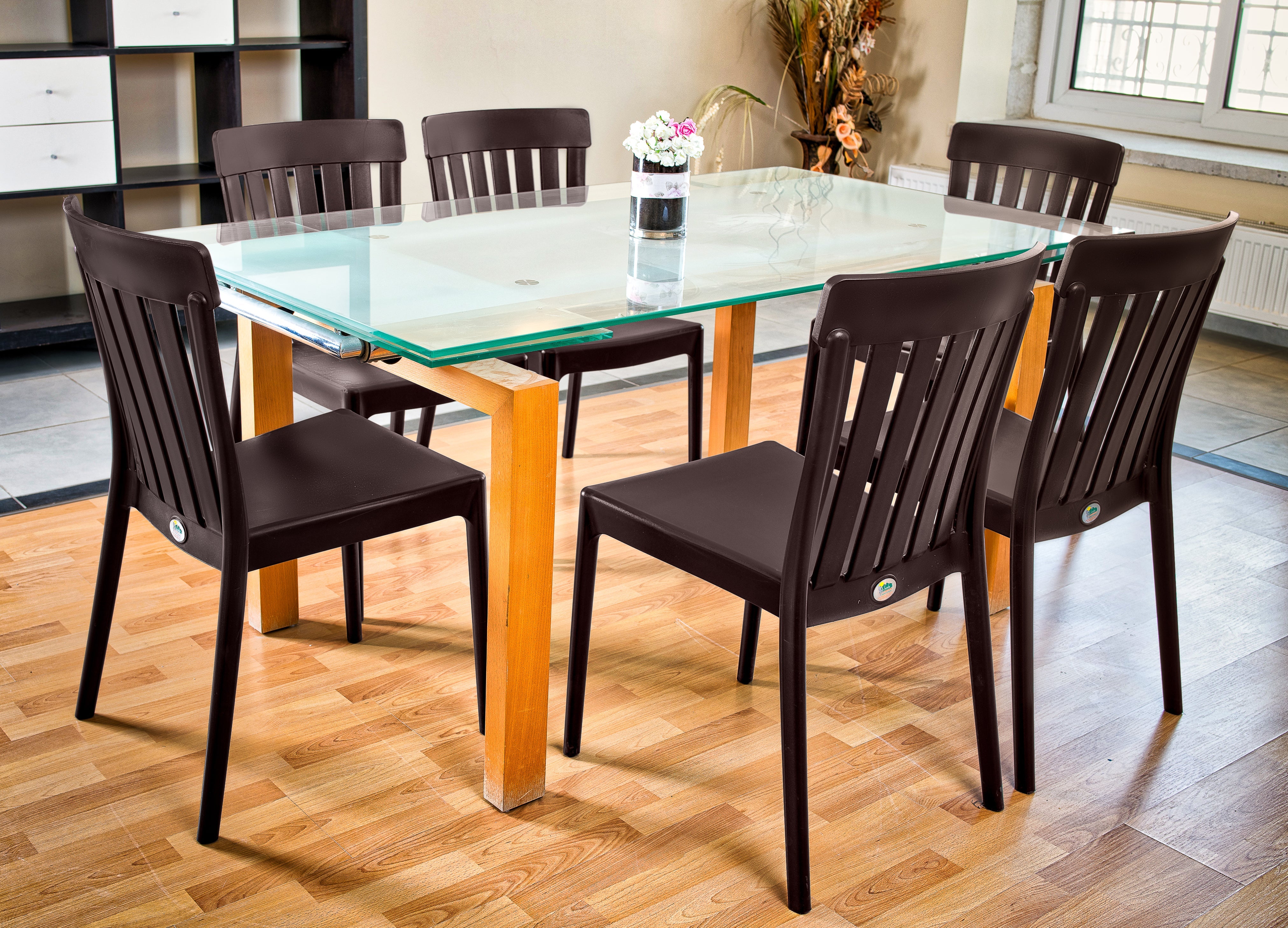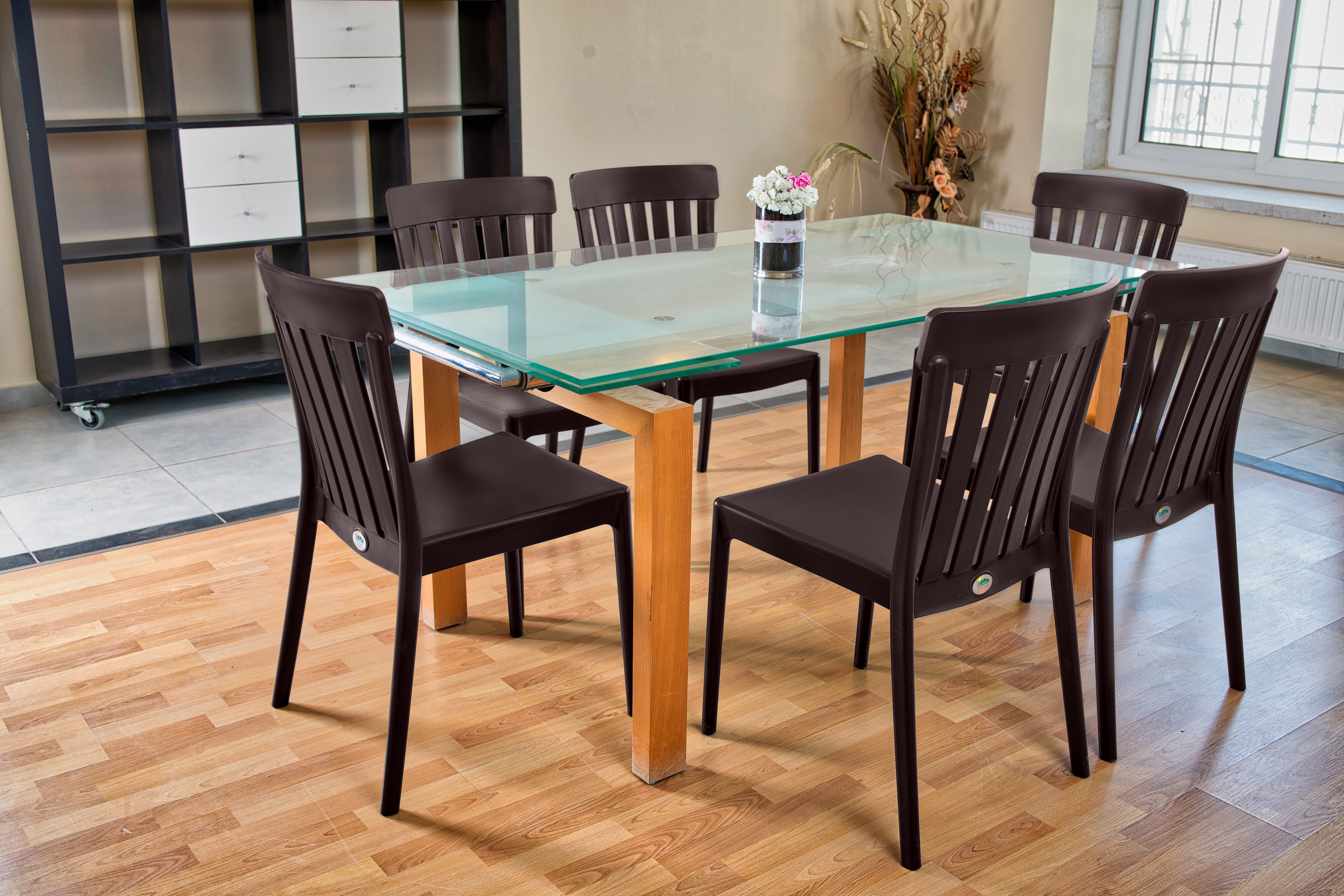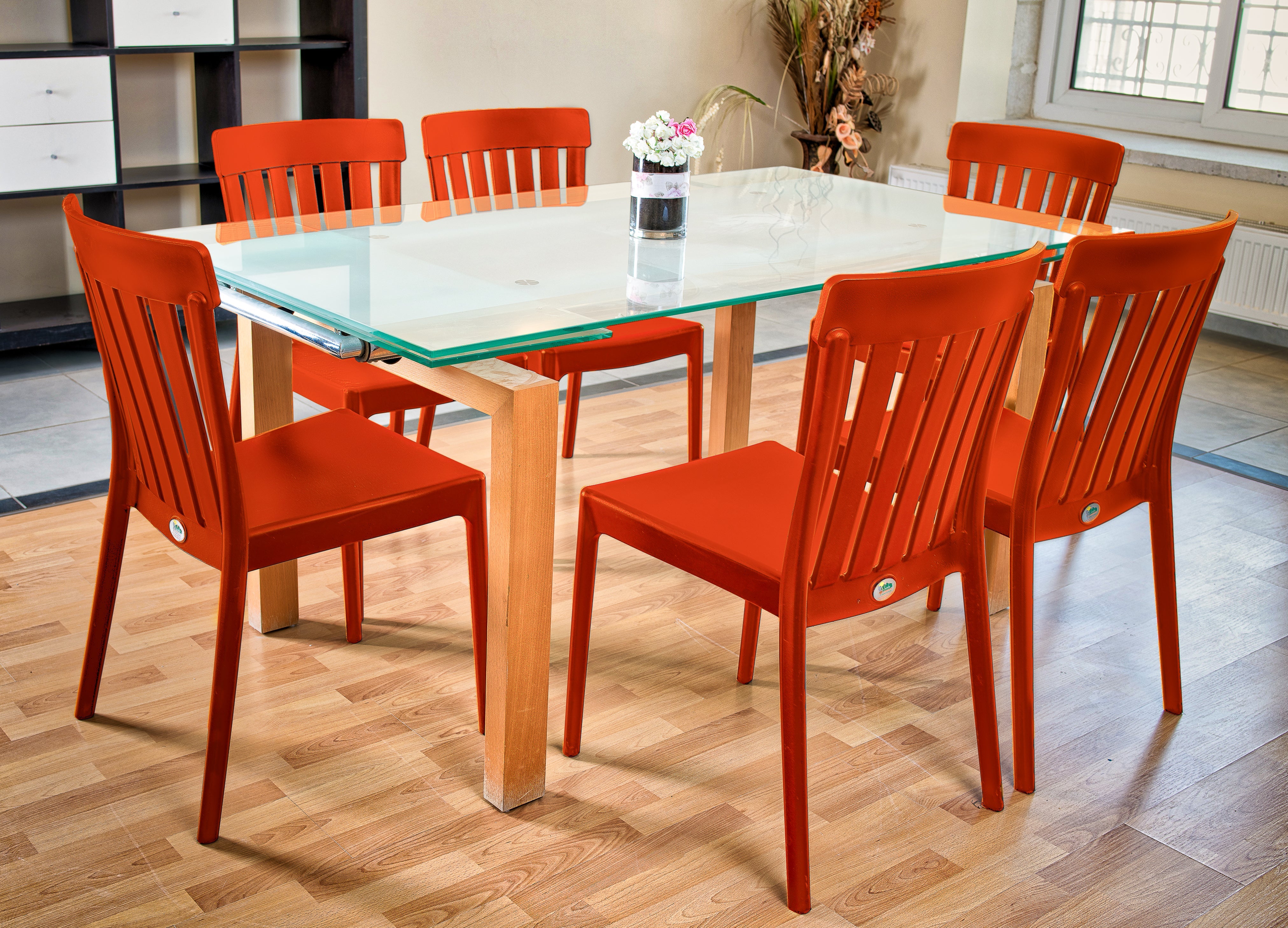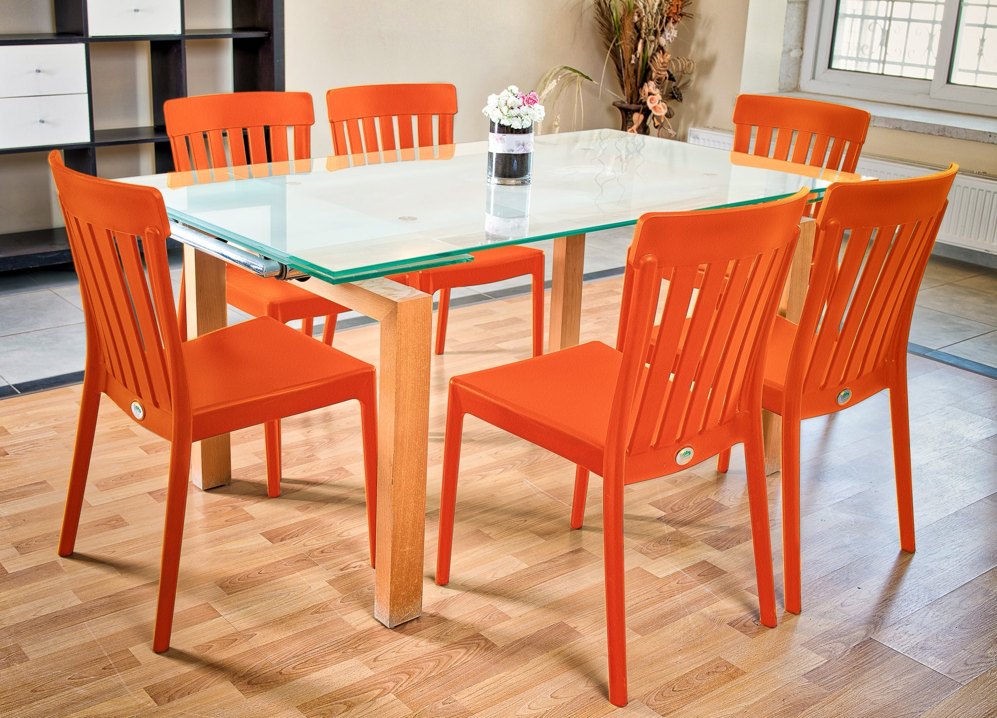 - كرسي بلاستيكي أنيق بدون أذرع، مثالي للاستخدام الداخلي والخارجي.