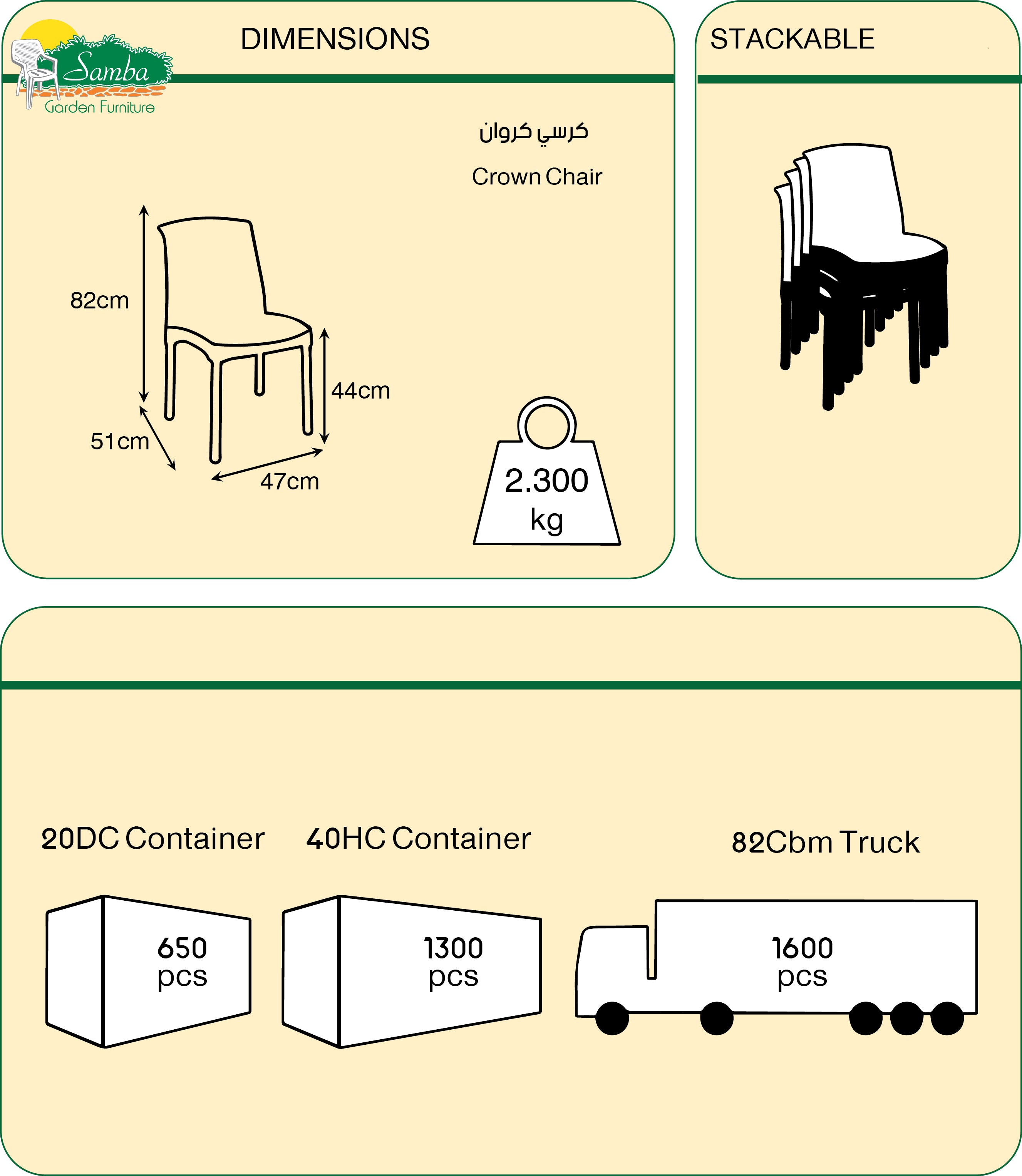 شرح موجز للخواص العامة: كرسي كراون هو خيار مثالي للمساحات الداخلية والخارجية، يتميز بتصميم عصري وألوان مبهجة. يجمع بين المتانة والجمالية، مما يجعله إضافة رائعة لأي مكان. اختر كرسي كراون لتضفي لمسة حيوية على ديكورك.