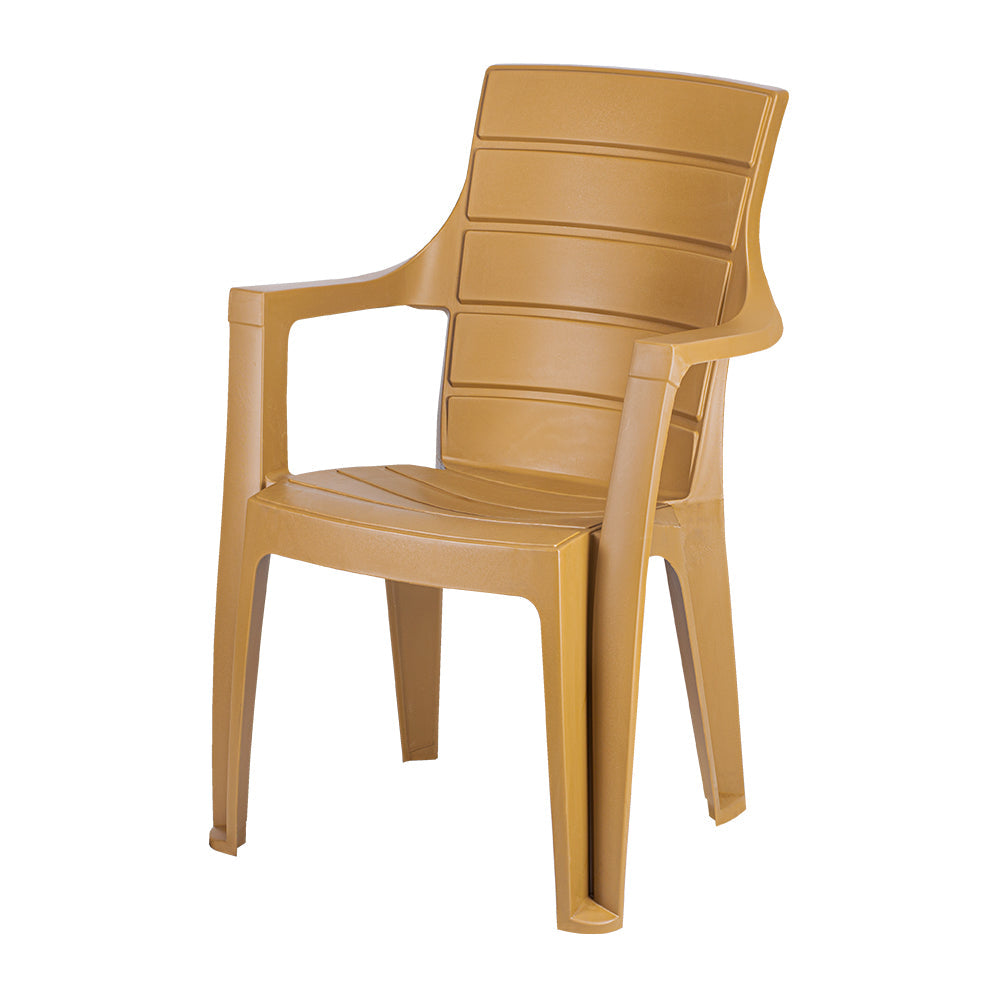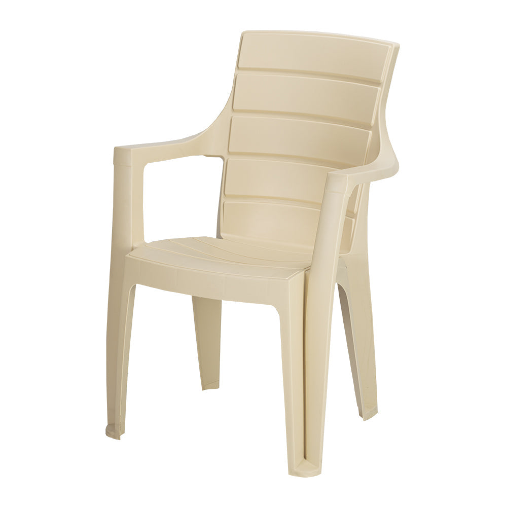 • كرسي بلاستيكي بذراعين قابل للتصفيت للاستعمال الداخلي والخارجي.