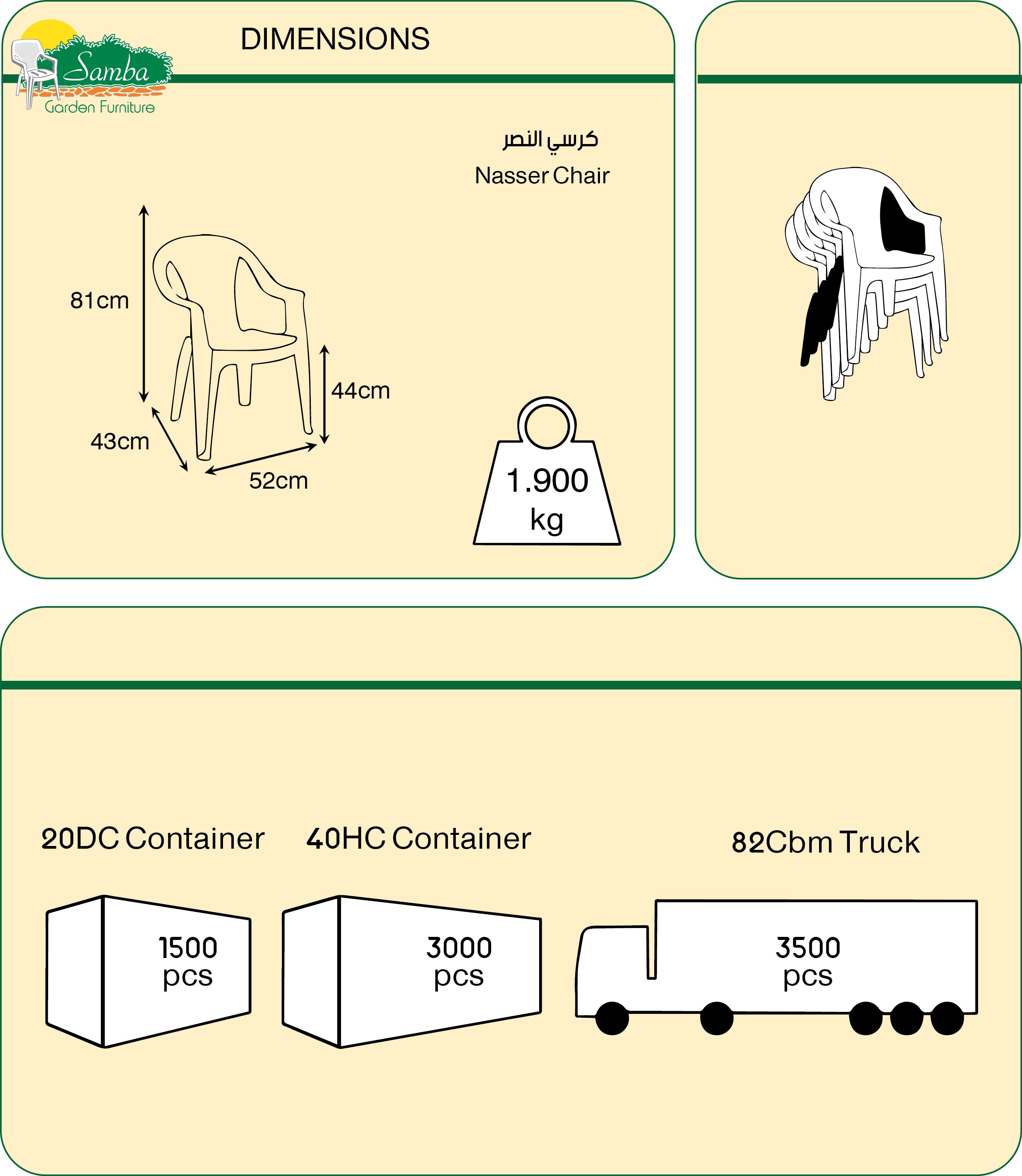 يتميز كرسي سوبر نصر من سامبا بتصميمه العصري والمتعدد الاستخدامات. يوفر الراحة والمرونة للاستخدام في أي مكان، مما يجعله الخيار المثالي لجميع احتياجاتكم. سواء كنتم تبحثون عن إضافة لمسة جمالية لمنزلكم أو تنظيم فعاليات خارجية، فهذا الكرسي يضمن لكم تجربة مريحة وأناقة لا مثيل لها.