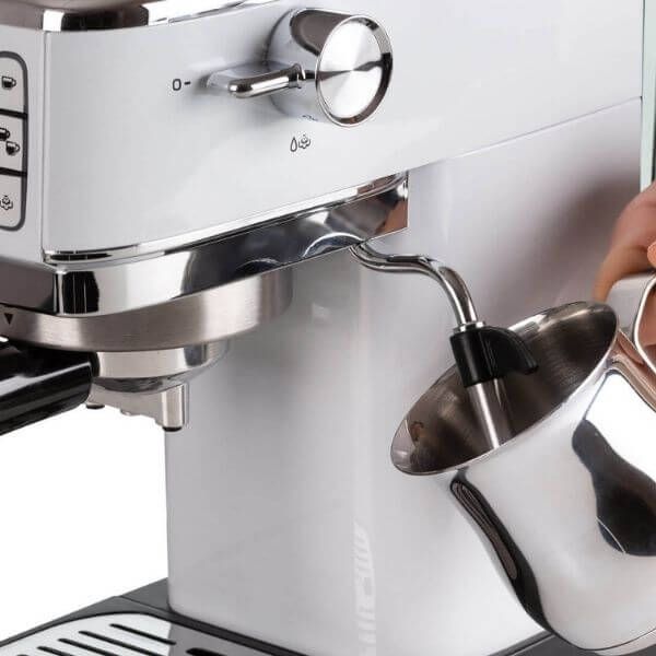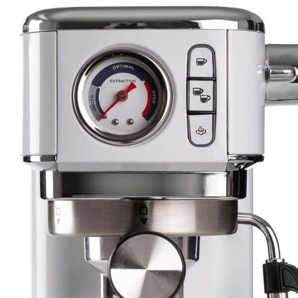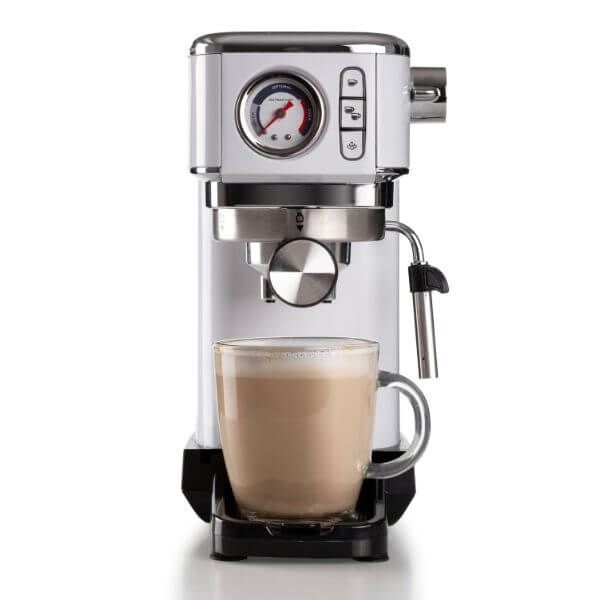 آلة اسبريسو Ariete Moderna Slim Whiteاسم المنتج بالعربي: آلة اسبريسو Ariete Moderna Slim 1300W 1381 Whiteاسم المنتج بالإنجليزي: Ariete Moderna Slim Espresso Machine 1300W 1381 WHTالماركة: Arieteالمجموعة: Modernaوصف المنتج والميزات:الطاقة والضغط: تعمل بطاقة 1300 واط وتوفر ضغطًا بقوة 15 بار لتحضير قهوة إسبريسو غنية ومثالية.تصميم أنيق: جسم نحيف ومدمج من الستانلس ستيل بتصميم عصري.مرونة التحضير: متوافقة مع القهوة المطحونة والكبسولات، مما يمنحك خيارات متعددة لتحضير قهوتك.نظام تسخين متقدم: تحتوي على نظام تسخين حراري (Thermoblock) يضمن تسخينًا سريعًا ومستقرًا للماء.التحكم الذكي: مزودة بميزان حرارة ومقياس ضغط، وأزرار معدنية مع 3 أضواء LED، بالإضافة إلى إمكانية حفظ إعدادات طول القهوة المفضلة لديك.وظائف متعددة: تحتوي على أنبوب لتقديم الماء الساخن لتحضير الشاي، وأداة مخصصة لتحضير الكابتشينو.ملحقات متكاملة: تأتي مع 3 فلاتر (لكوب واحد، كوبين، وللكبسولات)، وملعقة، وأداة تنظيف.سهولة الاستخدام والتنظيف: خزان ماء قابل للإزالة بسعة 1.1 لتر، وصينية تقطير قابلة للإزالة. كما أن حامل الفلاتر الثقيل مصنوع من الألمنيوم الصب بمقبض من الباكليت.ميزات إضافية: إمكانية تعديل ارتفاع الصينية الحاملة للأكواب حسب الكوب المستخدم، وإيقاف تشغيل تلقائي بعد 25 دقيقة لتوفير الطاقة.المواصفات الفنية:القياسات: الارتفاع 29 × العرض 14 × العمق 34 سمبلد المنشأ: تصميم إيطالي وصناعة صينية.شرح موجز للخواص العامة:تُعتبر آلة اسبريسو Ariete Moderna Slim خيارًا ممتازًا لمن يبحث عن جهاز عملي وأنيق لتحضير القهوة في المنزل. بفضل تصميمها النحيف وميزاتها المتقدمة، تجمع بين الأداء القوي وسهولة الاستخدام.