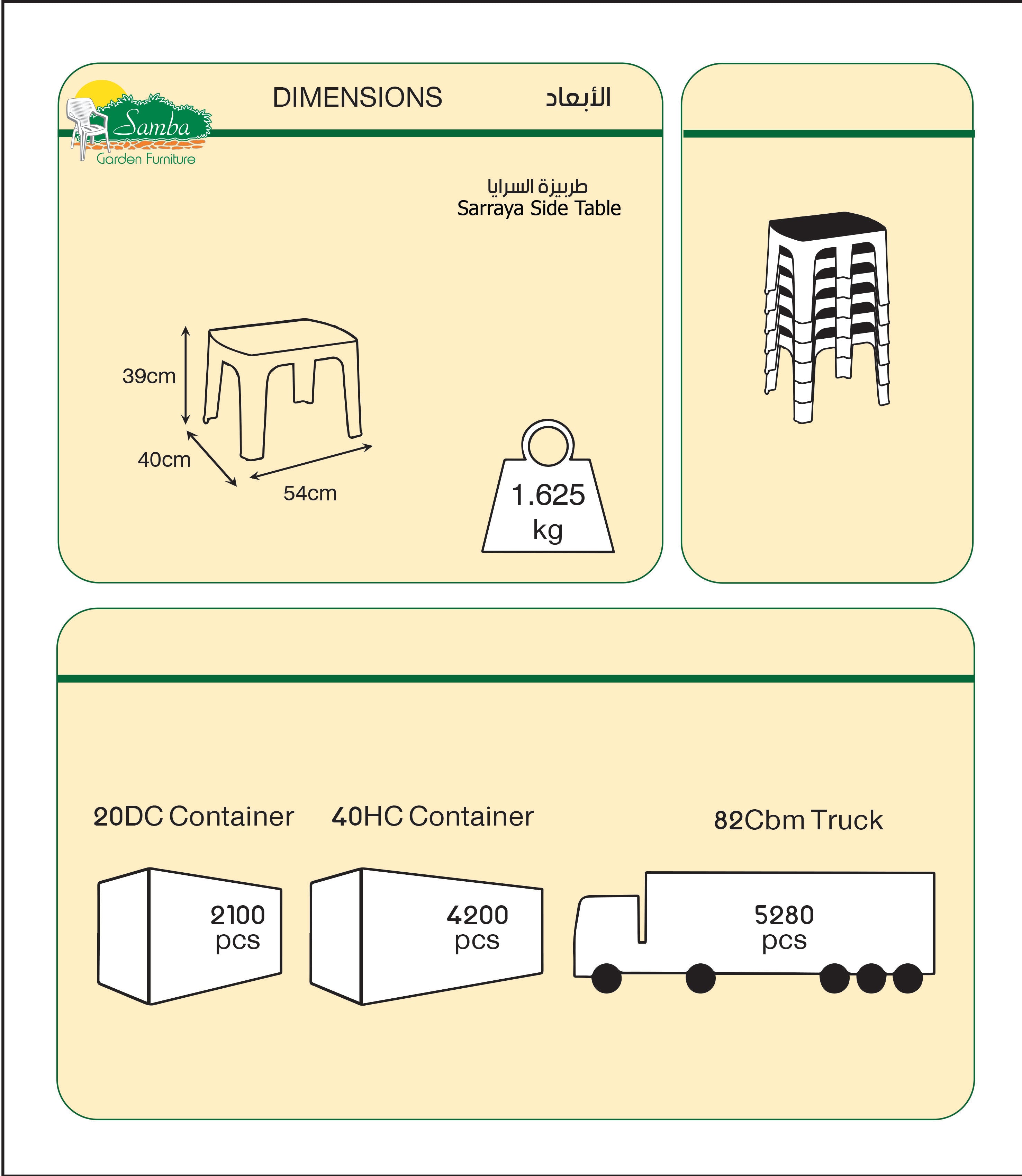 شرح موجز للخواص العامة: طربيزة سرايا هي الخيار المثالي لتلبية احتياجاتكم في مختلف المناسبات. تتميز بسهولة التوضيب والتخزين، مما يجعلها مثالية للاستخدام الداخلي والخارجي. اختر من بين الألوان المتعددة لتناسب ذوقك.