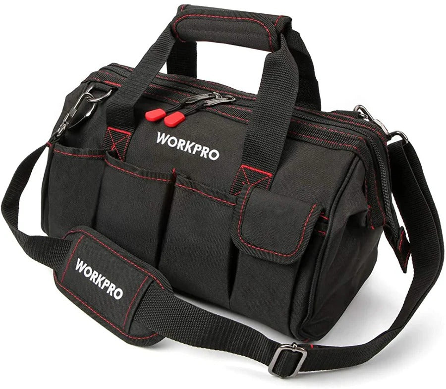 حقيبة WORKPRO W081021WE بسعة 14 بوصة مصممة للمحترفين والهواة. مصنوعة من قماش بوليستر 600D المتين، توفر مقصورة رئيسية واسعة مع فتحة علوية واسعة للوصول السهل إلى الأدوات. تتميز الحقيبة بوجود 13 جيبًا للتخزين المنظم، وحزام كتف قابل للتعديل لحمل مريح، وقاعدة معززة لحماية المحتويات من الصدمات.
