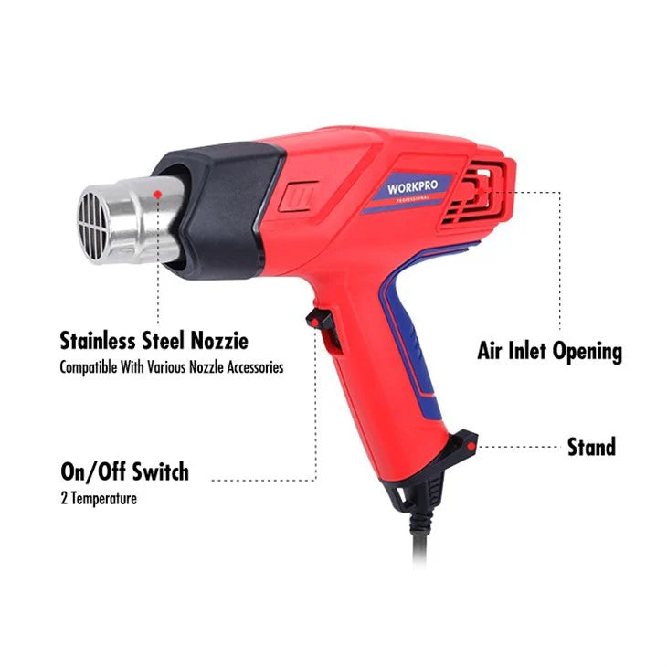 سشوار الحرارة WORKPRO WP474000 هو مسدس حراري احترافي بقوة 2000 واط، مصمم لمجموعة متنوعة من التطبيقات، بما في ذلك إزالة الطلاء، والتغليف بالانكماش، ولحام البلاستيك. يتميز بإعدادين لدرجة الحرارة وخيارات متعددة لتدفق الهواء، مما يجعله مناسبًا لكل من هواة الأعمال اليدوية والمحترفين.