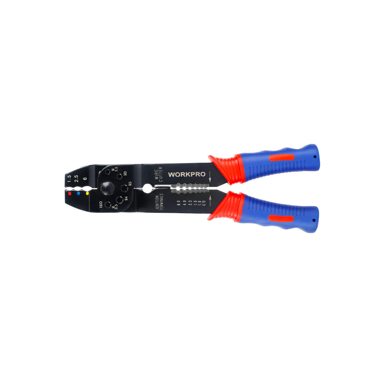 WORKPRO WP291001 هي أداة تعرية أسلاك متعددة الاستخدامات بقطر 200 مم (8 بوصات)، مصممة لقطع وتجريد وتجعيد الأسلاك التي تتراوح أقطارها بين 0.75 مم و6.0 مم. مصنوعة من فولاذ CR-V المتين، وتتميز بمقبض مطاطي TPR مريح لقبضة محكمة أثناء الاستخدام.