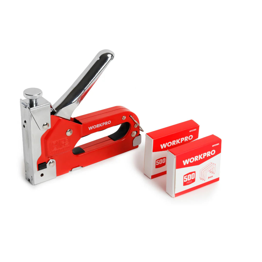 مجموعة دبابيس WORKPRO WP223005 متعددة الاستخدامات، مصممة لتطبيقات تثبيت متنوعة. تتسع لدبابيس من النوع D، والنوع U، والنوع T، مما يجعلها مناسبة لأعمال التنجيد والنجارة والإصلاحات العامة.
