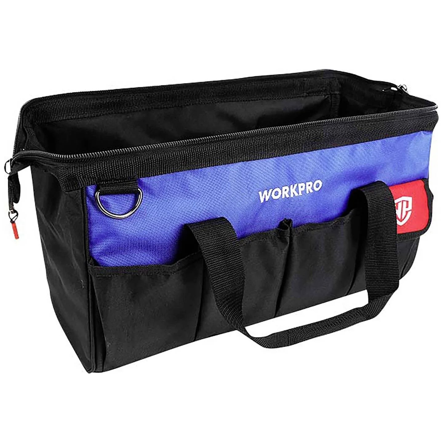 حقيبة WORKPRO WP281005 بسعة 18 بوصة (460 مم) مصممة للمحترفين والهواة. مصنوعة من قماش بوليستر 600D المتين، توفر مقصورة رئيسية واسعة مع فتحة علوية واسعة للوصول السهل إلى الأدوات. تتميز الحقيبة بوجود 13 جيبًا للتخزين المنظم، وحزام كتف قابل للتعديل لحمل مريح، وقاعدة قوية لحماية المحتويات من الرطوبة والصدمات.