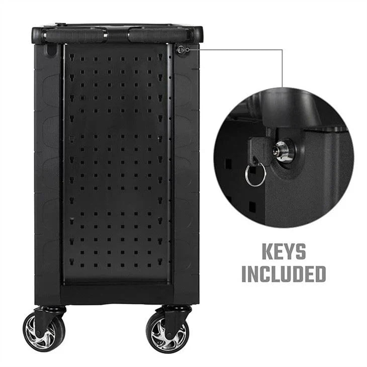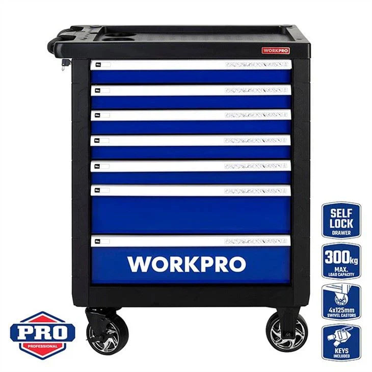خزانة الأدوات المتنقلة WORKPRO WP285002 مصممة لتوفير تخزين فعال للأدوات وسهولة في التنقل. مصنوعة من الفولاذ المتين مع تشطيب مقاوم للتآكل، وتتميز بمساحة تخزين واسعة وآلية قفل آمنة، مما يجعلها مثالية للورش والمرائب والبيئات الصناعية.